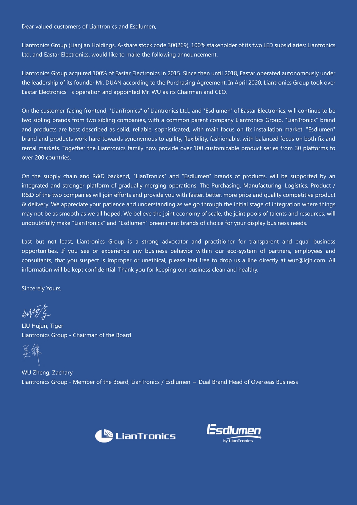 A Letter to Customers of LianTronics & Esdlumen: The Next Chapter of Our Story!