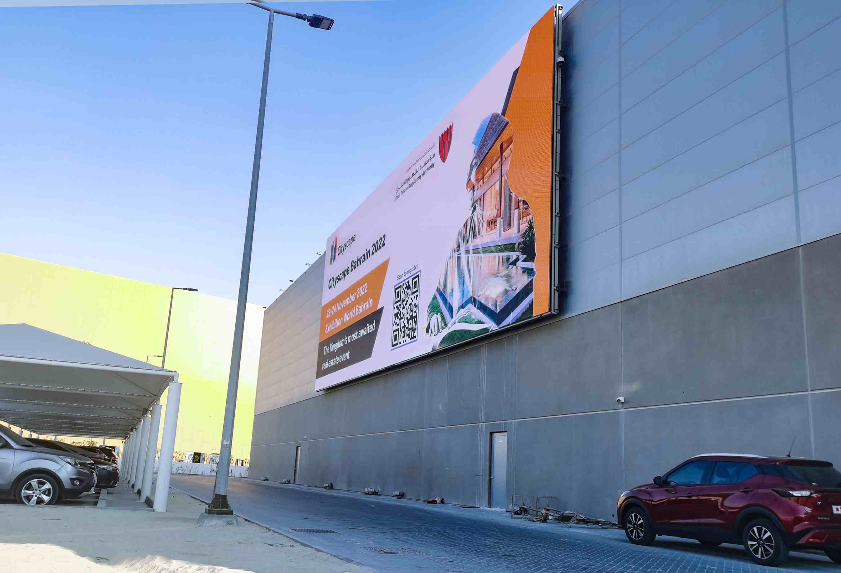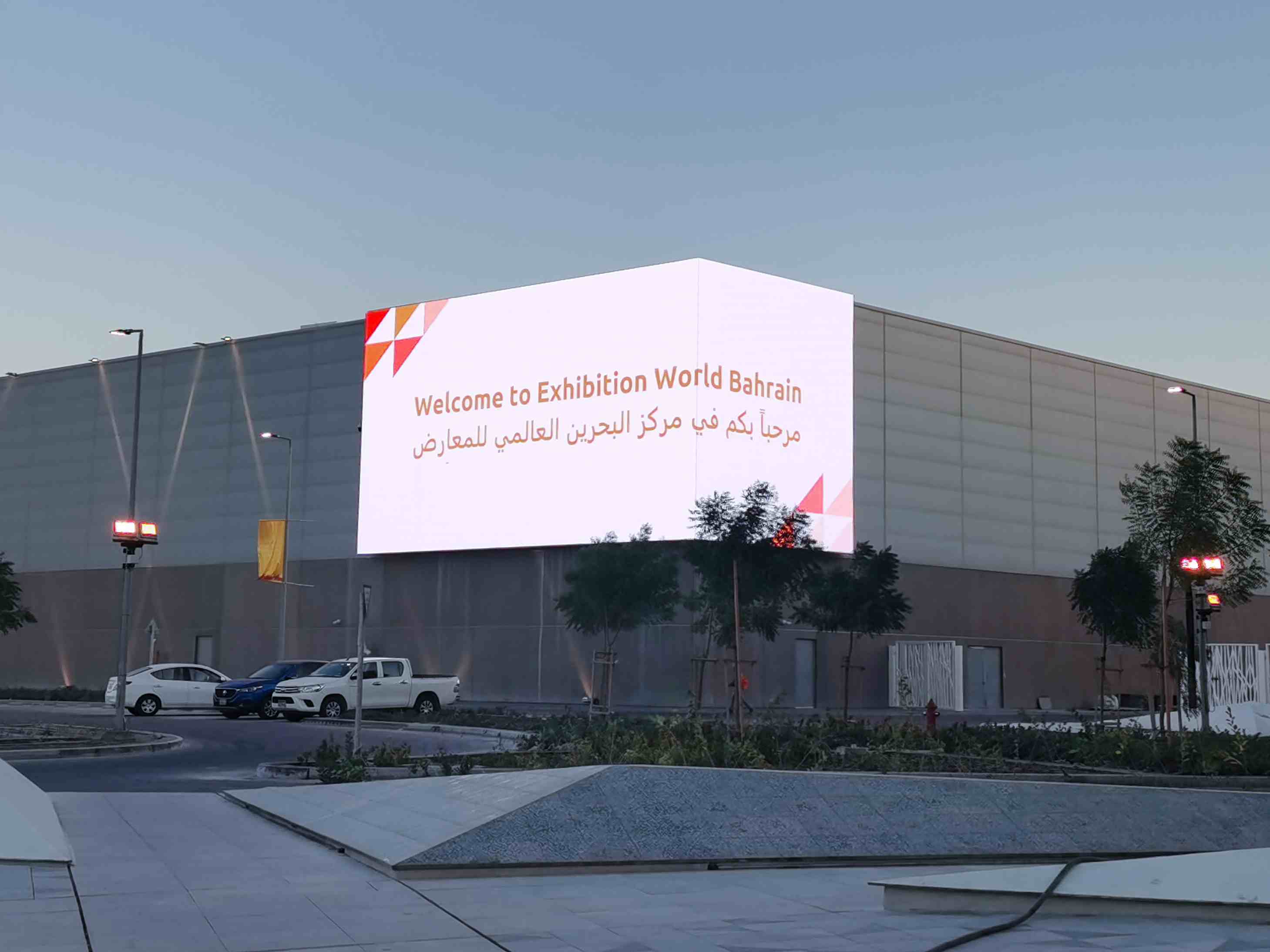 The three large LED screens are settled onto the facade of Hall 1 to 3 of Exhibition World Bahrain, delivering the latest show information of the centre. Among them, two LED screens are designed into L-shapes to facilitate easier-to-be-caught visuals such as naked-eye 3D content.