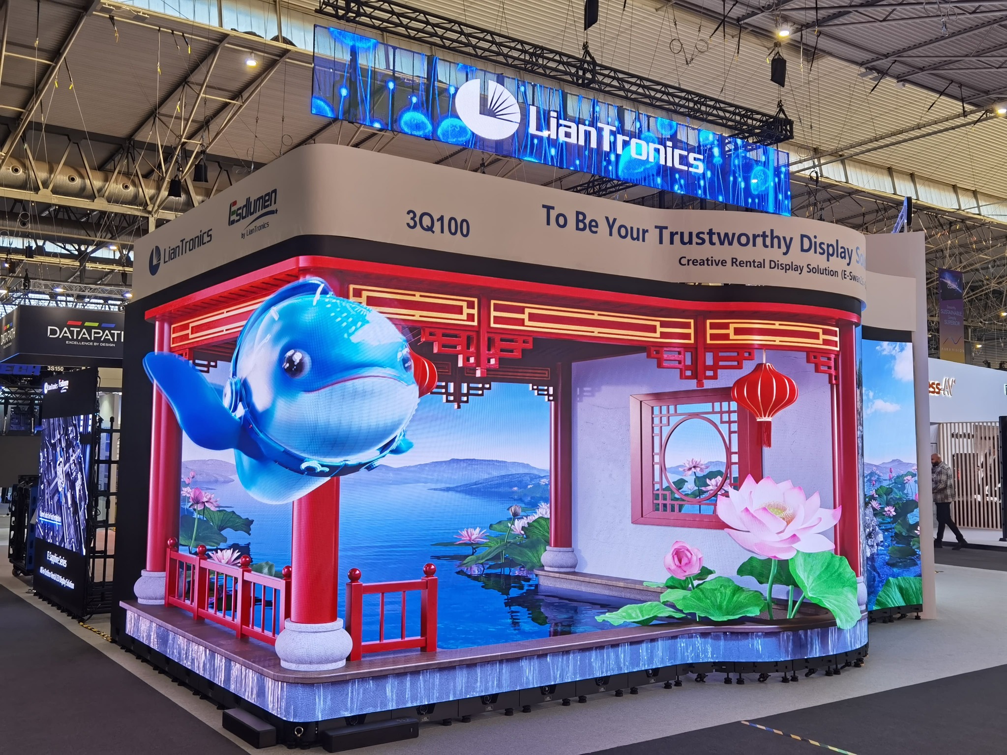 The sleek wave-shaped display greeting visitors at Esdlumen' booth entrance is crafted from a creative rental product set. One of models is E-Swan Series, featuring nine adjustable arcs that enable a multitude of creative shapes. Complementing this is the E-Corner Series, a 90° small arc corner LED display suitable for indoor and outdoor, rental, and fixed installation scenarios. The display has garnered significant attention and sparked discussions among attendees. The rental portfolio also boasts the one-stop E-Sapphire Series, supported by dollies, wind-bracing frames, and stacking frames for swift and seamless assembly.
