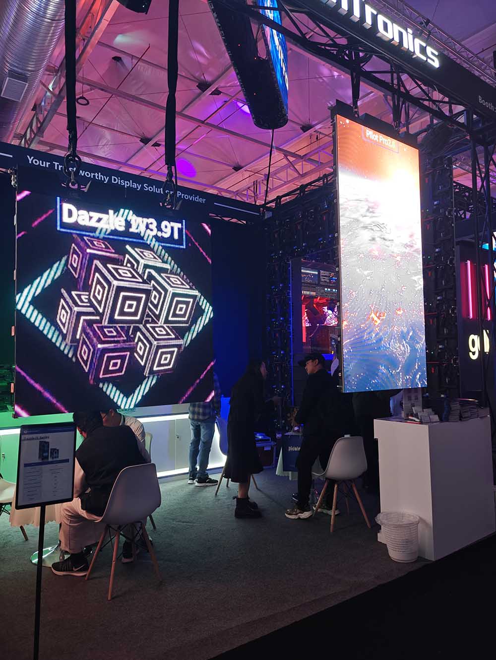 Esdlumen’s irregularly curved pillar screen is hanging directly above the booth. The solution combines BIM Plus-X Series with BIM MIN Series, both hot selling in commercial applications. Mixed splicing with BIM MIN Series, the BIM Plus-X Series can form many creative irregular curved shapes.