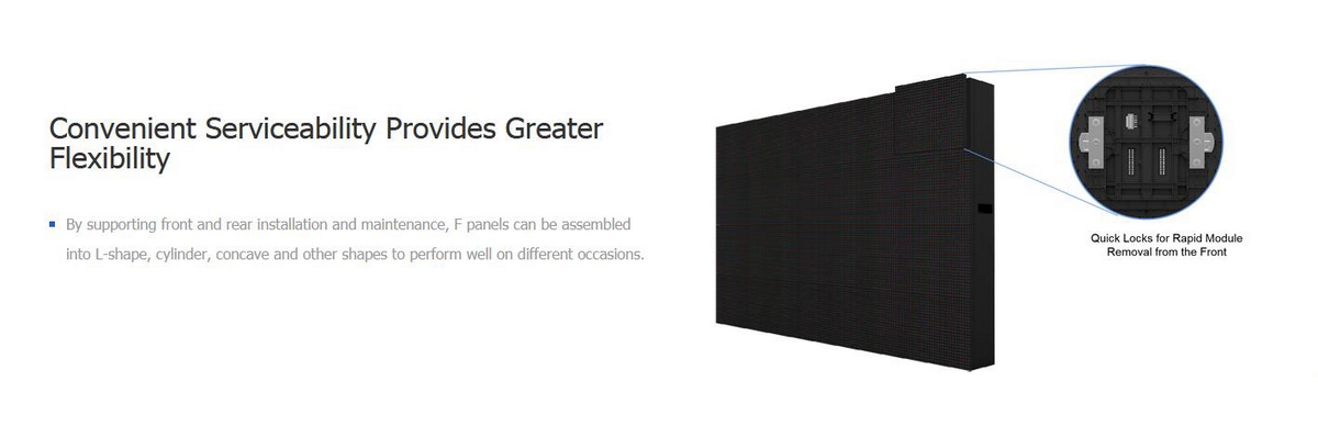 By supporting front and rear installation and maintenance, F panels can be assembled into L-shape, cylinder, concave and other shapes to perform well on different occasions.