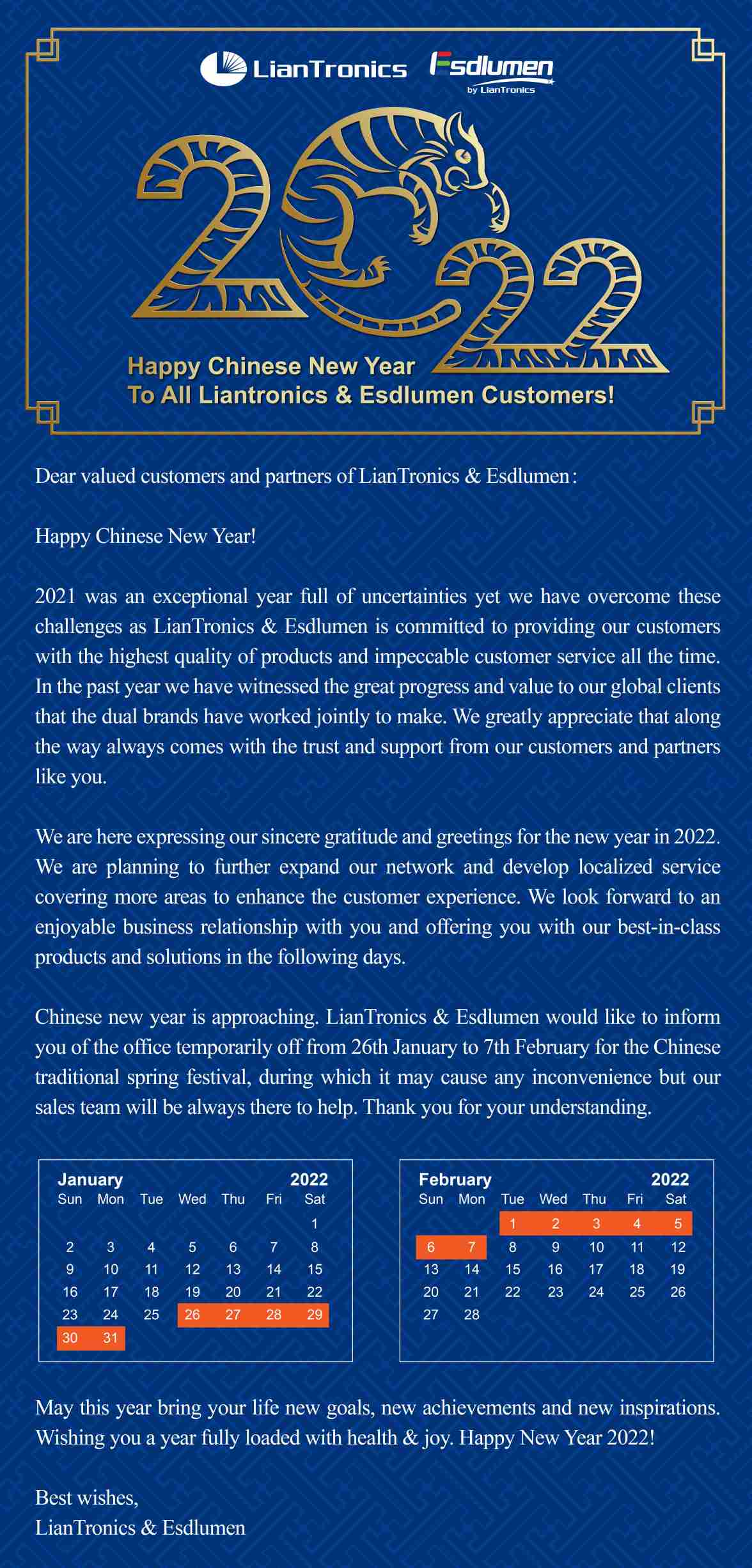 Happy Chinese New Year to All Liantronics & Esdlumen Customers and Partners!