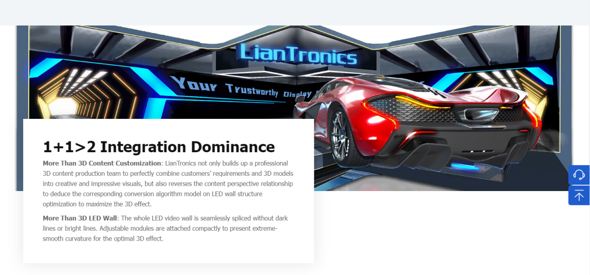 More Than 3D Content Customization: LianTronics not only builds up a professional 3D content production team to perfectly combine customers’ requirements and 3D models into creative and impressive visuals, but also reverses the content perspective relationship to deduce the corresponding conversion algorithm model on LED wall structure optimization to maximize the 3D effect.