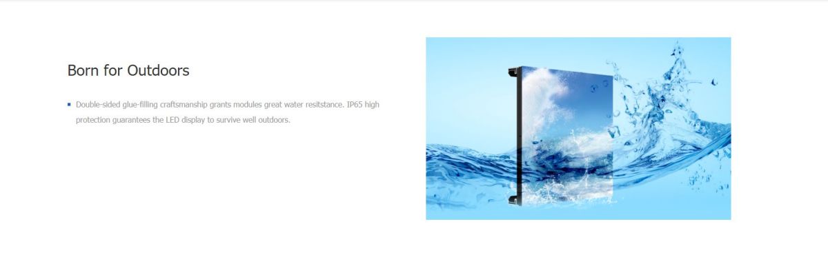 Double-sided glue-filling craftsmanship grants modules great water resistance. IP65 high protection guarantees the LED display to survive well outdoors.
