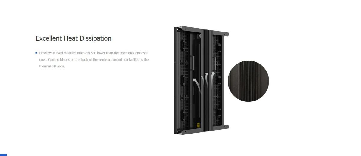 Hollow-curved modules maintain 5℃ lower than the traditional enclosed ones. Cooling blades on the back of the central control box facilitates thermal diffusion.