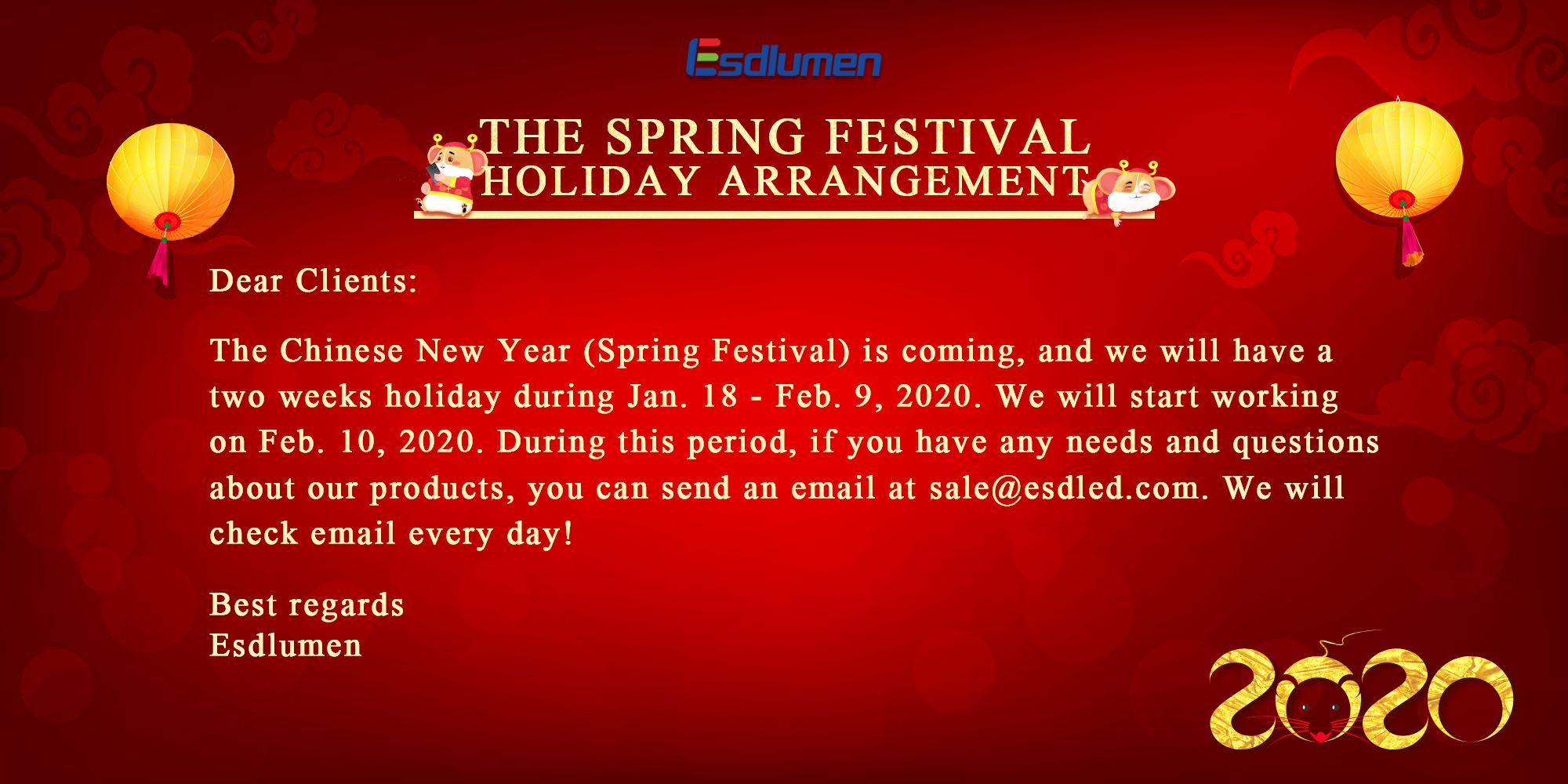 The Chinese New Year (Spring Festival) is coming, and we will have a two weeks holiday during Jan. 18 - Feb. 9, 2020. We will start working on Feb. 10, 2020. During this period, if you have any needs and questions about our products, you can send an email at sale@esdled.com. We will check email every day!