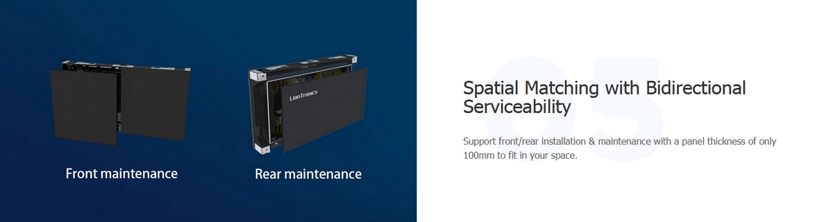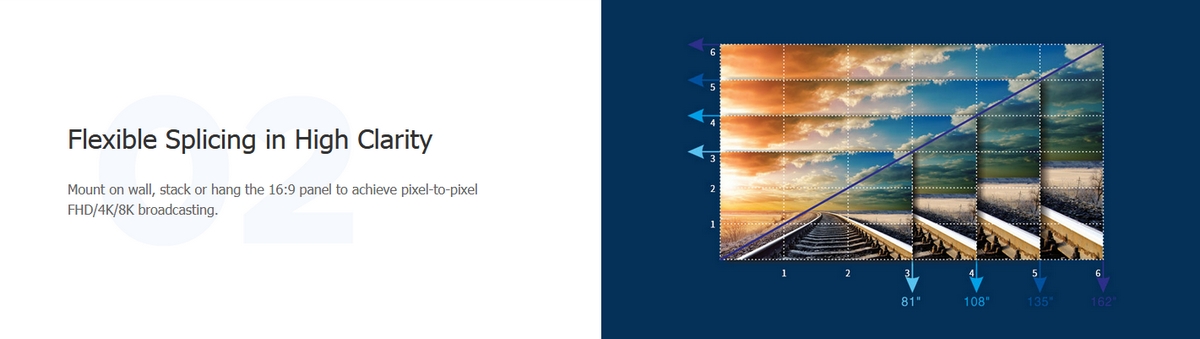 Mount on wall, stack or hang the 16:9 panel to achieve pixel-to-pixel FHD/4K/8K broadcasting.
