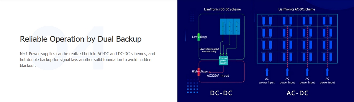 N+1 Power supplies can be realized both in AC-DC and DC-DC schemes, and hot double backup for signal lays another solid foundation to avoid sudden blackout.